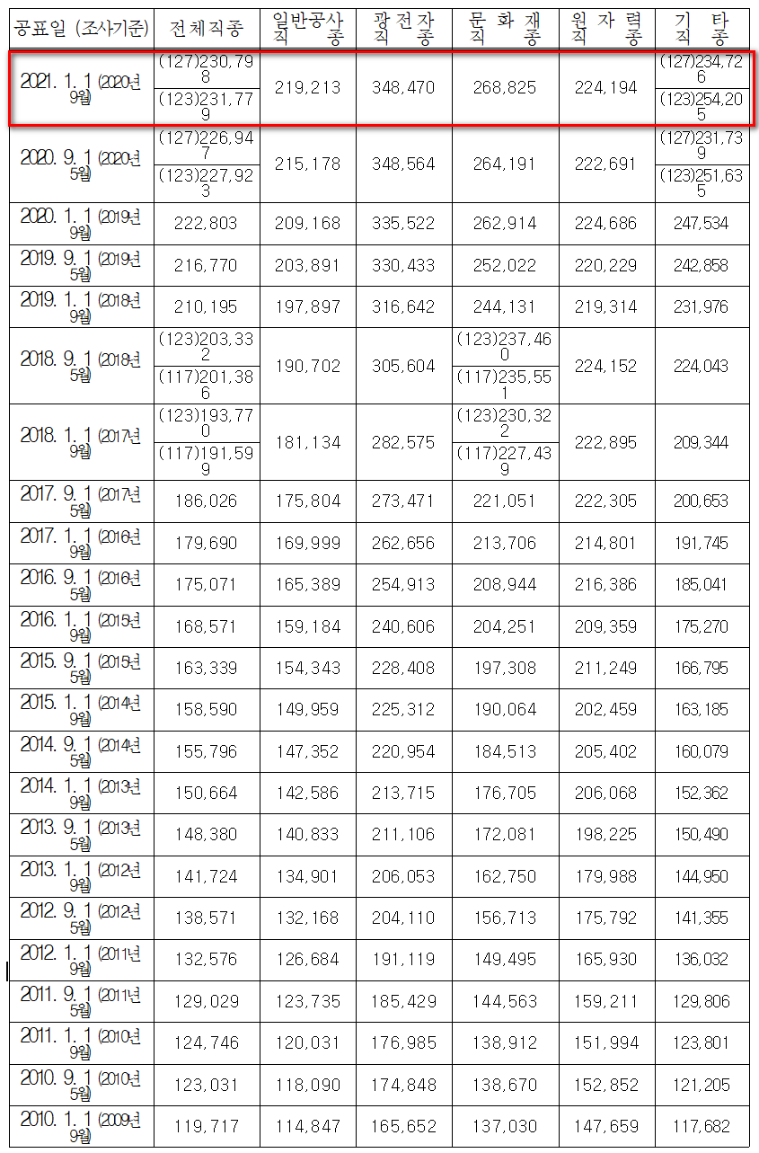 2021년 상반기 정부노임단가 평균 임금표 비교