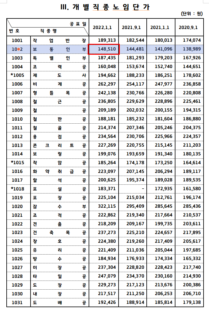 우선 도표에 실려있는 금액과 현실적으로 지급받는 금액에 대해 차이가 있을수 있습니다. 개인적인 경험을 토대로 보자면 도표의 수치는 표본적인 내용이고 실제로 지급받는 부분은 약간 다를수 있습니다. 그에 대한 부분은 현장에서 적용되는 근속임금에 대한 추가적인 지급금이 있기에 그런 부분들이 부분적으로 반영되어 전체적인 1일 당 임금이 책정되는 상황이 많기 때문입니다.